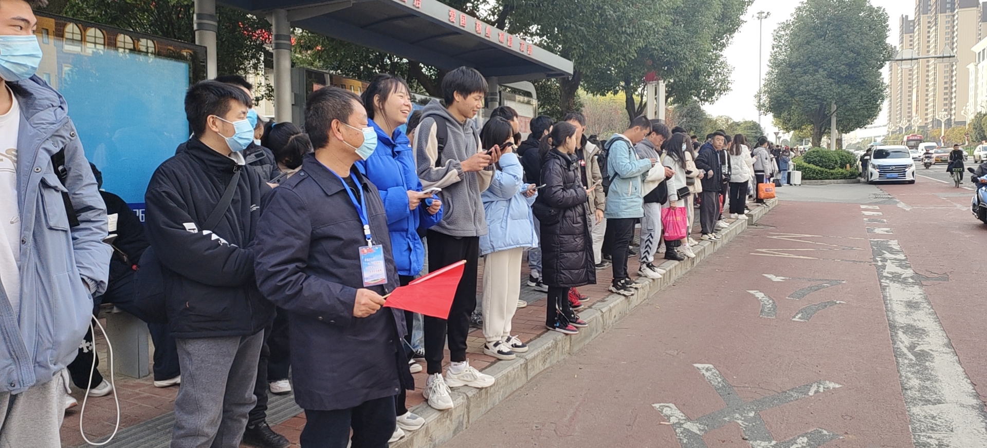 公交站臺旁,志愿者們引導(dǎo)乘客自覺有序排隊乘車,提醒他們提前準(zhǔn)備好乘車碼或公交卡,耐心回答乘客咨詢的問題,并維持車輛進站秩序,有效緩解公交站臺乘客上下車的交通壓力。